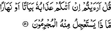 Say: “Do you see that if His punishment were to overtake you as a night-raid, or by day,— which part of it would the guilty wish to hasten on?”