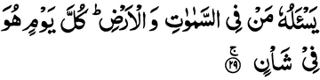 Everyone in the heavens and the earth implores Him. Every instant He is in a splendor.