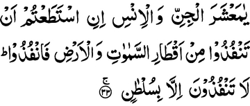 O you collective body of the Jinn and the men! if you earn capability to penetrate the regions of the heavens and the earth,