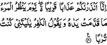 Surely We have warned you of a punishment close by— the day whereon man will see what his two hands have sent forward,