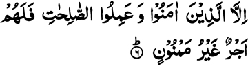 except those who believe and do good, for them is then a reward without interruption.