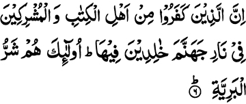 Verily those who reject Faith from among the People of the Scripture and the polytheists, will be in the Fire of Gehenna, abiding in it. These— they are the worst creatures.