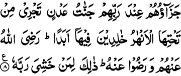 Their reward in the Presence of their Rabb will be Gardens of Eden, beneath which flow the rivers, abiding in them all the time. Allah is well-pleased with them, and they