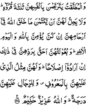 if they wish for reconci-liation. And they have rights similar to those against them in a just manner. Yet men have a stage above them. And Allah is Exalted in Might, most Wise.