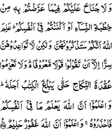 Allah knows whether you will remember them, yet do not give promise to them secretly except that you speak an honorable speech. And do not confirm the marriage