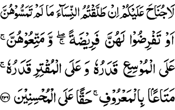 There is no blame on you if you divorce women while yet you have not touched them, nor you have fixed for them a portion.
