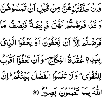 appointed unless they forgo or they forgo in whose hands is the marriage tie. And if you forgo, it is nearer to reverence. And do not forget benevolence between yourselves.