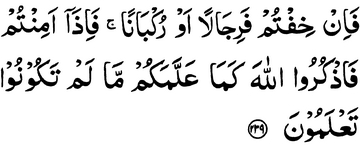 But if you are in fear, then on foot or while riding; but when you are safe, then remember Allah as He has taught you what you were not knowing.