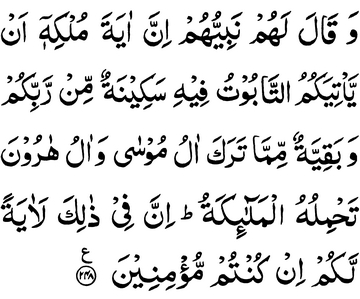 And their nabi said to them: “Surely the sign of his kingdom is that there will come to you the Tabut in which there is