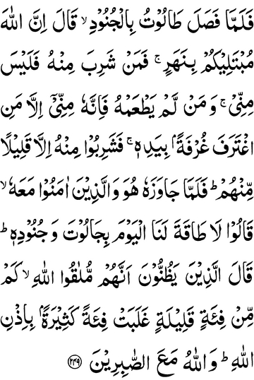 So when Talut marched out with the forces, he said: “Surely Allah is going to test you by a river; so whoever drinks of it