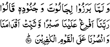 And when they confronted Jalut and his forces, they said: “Our Rabb! pour down upon us perseverance, and make our feet firm,