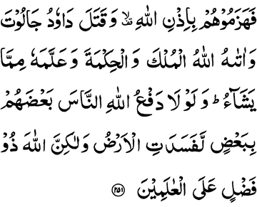 and the wisdom; and taught him of what He pleased. And had there not been Allah’s repelling mankind— some of them by others— the earth would certainly be in