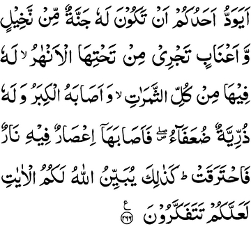 in which there is for him all kinds of fruits, and old age having overtaken him while he has weak offspring; then a whirlwind in which there is a fire smites it,