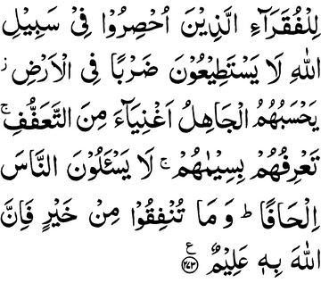 be rich on account of abstaining. You can recognize them by their impression— they do not beg of men persistently. And whatever of good you spend, verily Allah is Knower of it then.