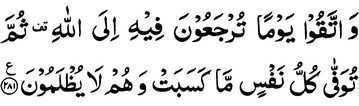And fear a Day whereon you will be made to return to Allah. Then every soul will be fully recompensed for what it has earned, and they will not be wronged.