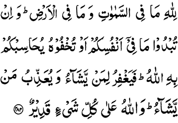 or keep it secret, Allah calls you to account for it. Then he protects whom He pleases, and He chastises whom He pleases. For Allah is Possessor of power over all things.