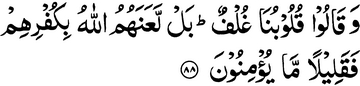 And they say: “Our hearts are the wrappings.” In fact, Allah has condemned them due to their disbelief; so little it is what they believe!