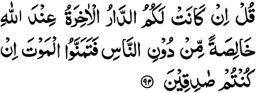 Say: “If the Future home in the presence of Allah be indeed for you especially to the exclusion of the people, then you wish for death, if you be truthful.”