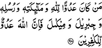 “Whoever is an enemy to Allah, and His malaks and His rasuls, and Jibril and Mikal, then of course Allah is an enemy to the Unbelievers.”