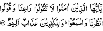 O you who believe! do not say Ra‘i-na, rather say: Unzur-na , and listen. And for the Unbelievers there is a painful punishment.