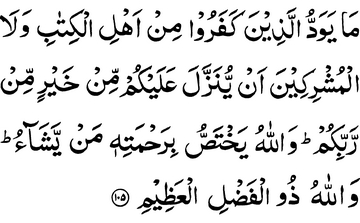 It is never the wish of those who disbelieve from among the People of the Scripture, nor of the polytheists, that any good be sent