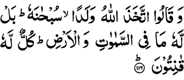 And they say: “Allah has taken a son”. Glory be to Him! Rather, whatever is in the heavens and the earth belongs to Him. All are obedient to Him.