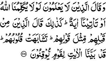 And those who do not know say: “Why does not Allah speak to us, or a Sign come to us?” Likewise those who were before them had said the like of their saying.
