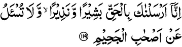 Certainly We have sent you with the Truth, as a bringer of glad tidings, and as a warner, and you will not be questioned regarding the fellows of the blazing Fire.
