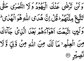 But the Jews will never be pleased with you, nor will the Christians be, until you follow their creed. Say: “Surely the guidance of Allah— that is the Guidance.”