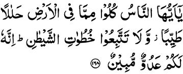 O you mankind! eat of what is on the earth, lawful, pure; and do not follow the footsteps of the Evil-one. Surely he is to you an open enemy.